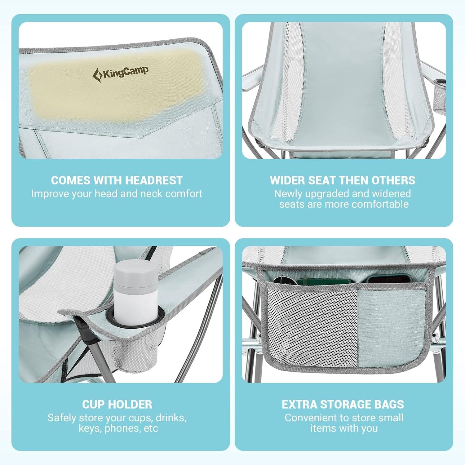 KingCamp lightweight folding chair is high back style, with padded headrest can provide you full support for back, neck and head, which is more suitable for longer time rest in outdoor activities such as garden patio, music festival, concert, park, barbeque, tailgating, trekking, cycling, climbing. Its foldable, lightweight and compact structure makes you easy to carry and store. Durable material makes you reliable to relax. Besides, mesh breathable material can make you feel cool in hot cliamte,and the added pocket can store your belongings. Your comfortable and wonderful outdoor experience is our greatest wish.