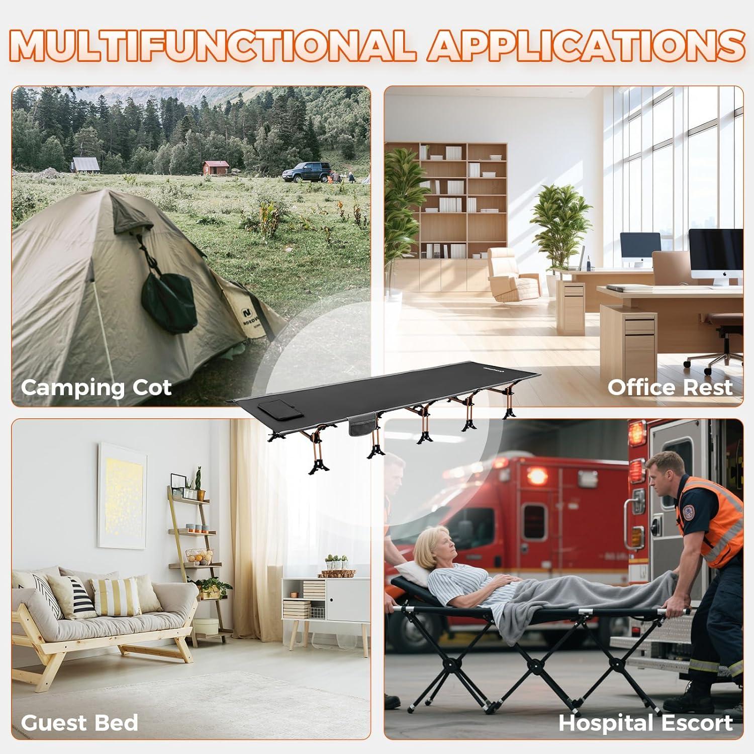 【STRONG AND STURDY】High strength flat 7075 Aluminum tubes frame and trapezoid symmetry design strengthens the camping cot bed and provides stability.All camping cots frame feet are designed of anti-slip plastic feet with more supporting space.