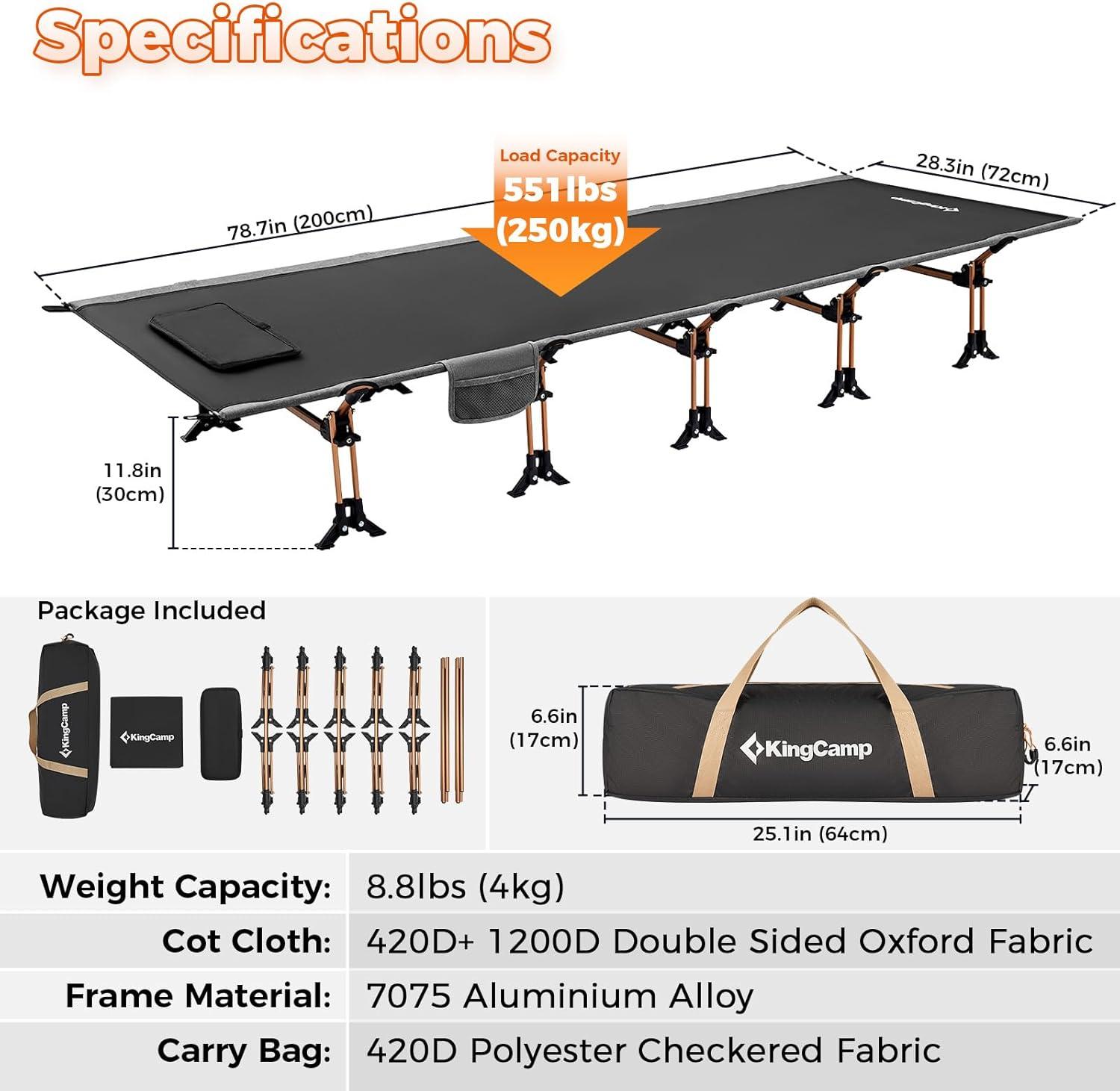 Kingcamp Camping Cot Portable Sleeping Cot for Adults Heavy Duty 81"x 30" Oversized Camp Cots with Pocket Folding Outdoor Camping Bed for Travel, Camp, Beach, Hike,Outdoor and Indoor Use(Black/Gold/Lightweight-load Capacity 551 Lbs)